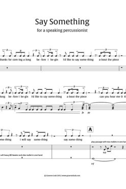 In English, the same words can have multiple and complex variations in meaning depending on the placement of stress, emphasis, and pitch. For instance, ‘I think’ differs significantly from ‘I think.’ Say Something’ is a collection of ambiguous text fragments and loops that are akin to Möbius strips, enigmatically seeming to arrive where they started. The performer is tasked with considering where to place stress, emphasis, and pitch in their delivery, all while playing a sometimes virtuosic drum accompaniment.