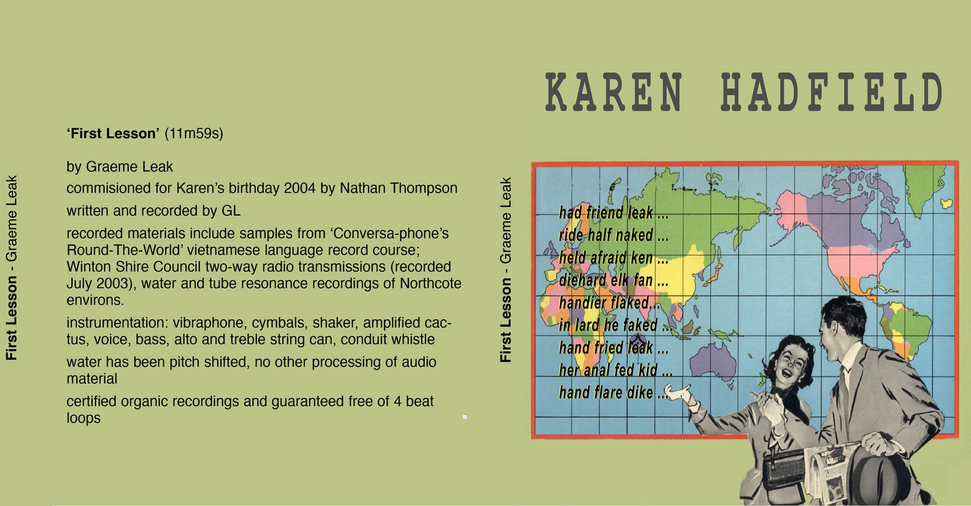 ‘Oradio’ for ABC Radio’s ‘The Listening Room‘ broadcast 22 May 1999. Composed, performed, recorded and mixed by GL in Northcote and at the La Trobe University Music Department studio, engineer Neil Kelly